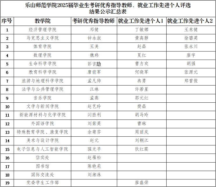 附件:乐山师范学院2025届毕业生考研优秀指导老师、就业工作先进个人评选结果公示汇总表