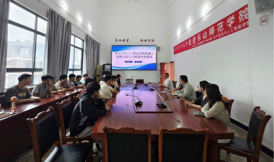 本网讯(文/刘天逸、图/王杰)为深化校企合作,促进学生高质量就业,9月23日,人工智能现代产业学院与乐山天峰机器人科技有限公司在特教C501联合举办校园专场面试。本次活动由乐山天峰机器人科技有限公司高管周羽翔带队开展招聘工作,电子信息与人工智能学院副院长黄果,辅导员肖苗、王杰,以及学院相关专业的学生共同参与。