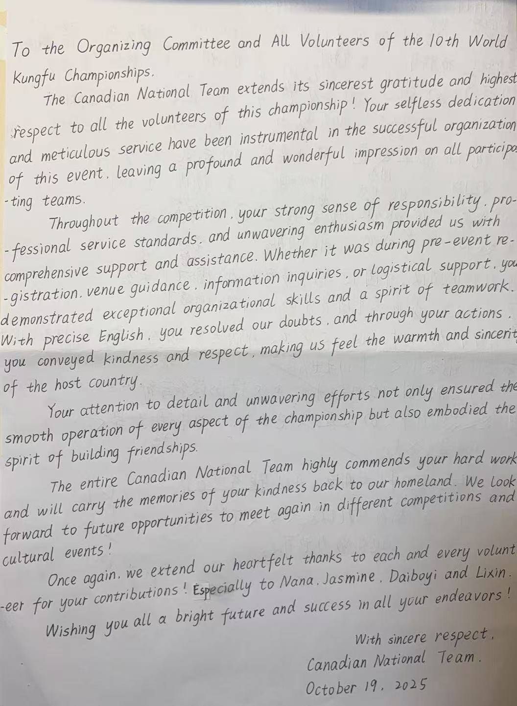 志愿服务期间,同学们始终恪守“奉献、友爱、互助、进步”的志愿精神,践行“高效协作、精准响应”的服务准则,不仅展现了过硬的语言功底,更体现了良好的团队协作意识、灵活的现场应变能力和深厚的文化理解力,成为连接赛事组委会与各国运动员不可或缺的沟通桥梁。多个外国代表团特意致信,对志愿者们的专业服务和温暖关怀表示衷心感谢。