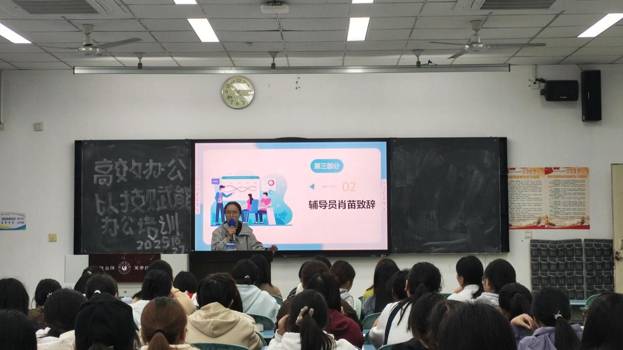 活动伊始,主持人首先宣读了培训纪律及要求为培训活动奠定了规范有序的基调。随后,辅导员肖苗上台致辞。她围绕培训的核心宗旨和开班意义,深入阐述了其在数字化时代的重要性与紧迫性,并着重强调了“以学促干、学以致用”的实践目标,为全体学员清晰规划了学习路径与努力方向,祝福同学们能够在此次课程中学有所获。