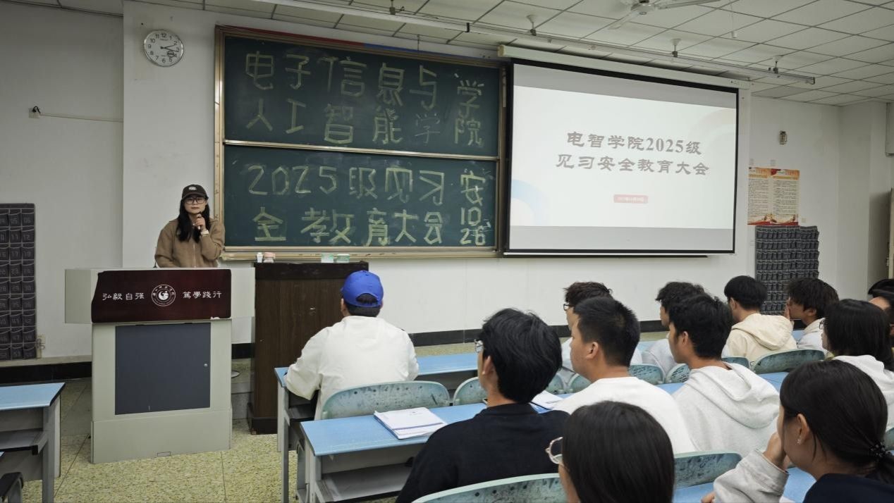 本网讯(文/王浩然图/吕培涛)为落实见习准备工作,强化学生安全意识,10月26日,电子信息与人工智能学院在行知楼325召开了2025级见习安全教育大会。本次大会由AI引航辅导员工作室主办,辅导员徐星悦以及2025级学生参加。