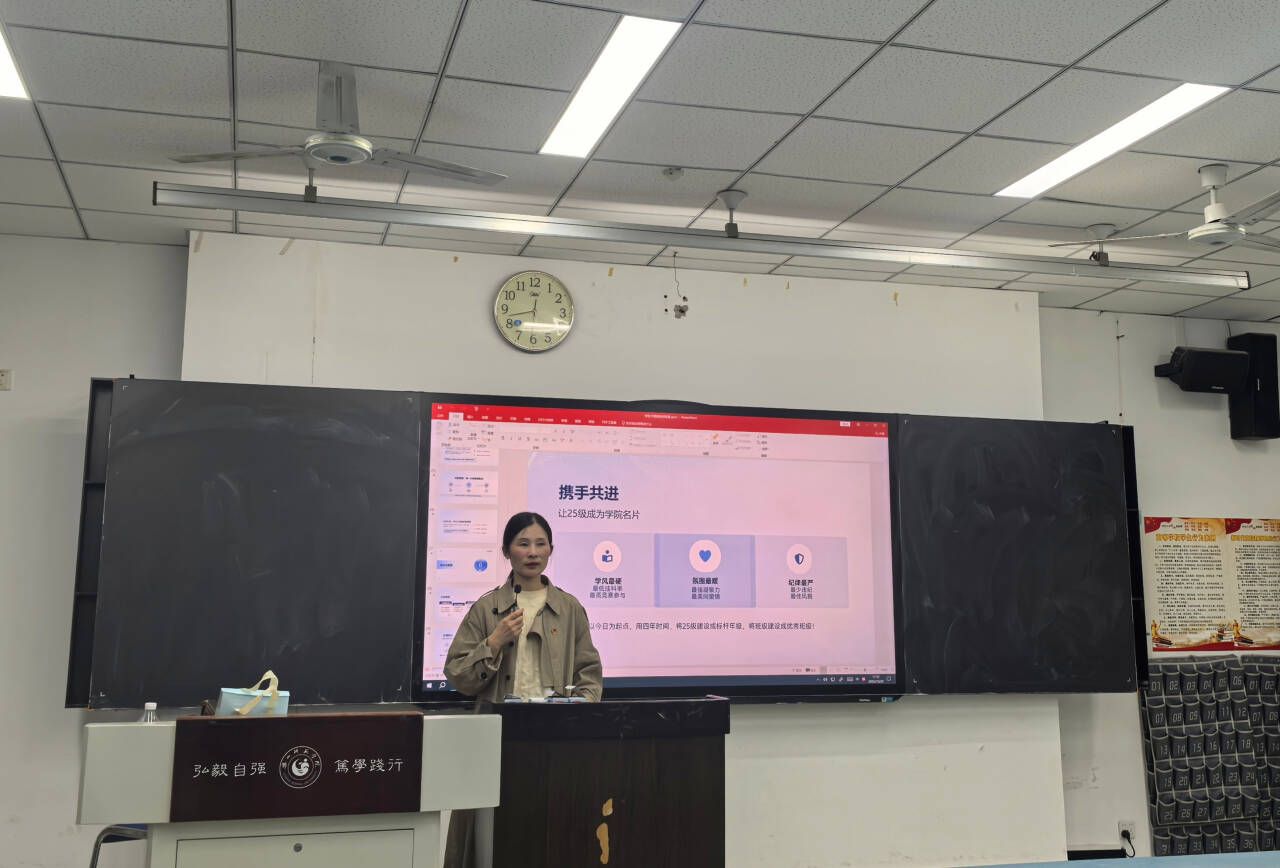 本网讯(文图/杜明珠)为加强新生班级建设,提升学生干部的综合素质与履职能力,数学与统计学院于10月30日下午,在行知楼212教室举行2025级学生干部履职能力培训会。学院党委副书记夏红为全体2025级班委、寝室长作了题为《明确角色定位,强化责任担当,争做新时代优秀学生干部》的专题培训。