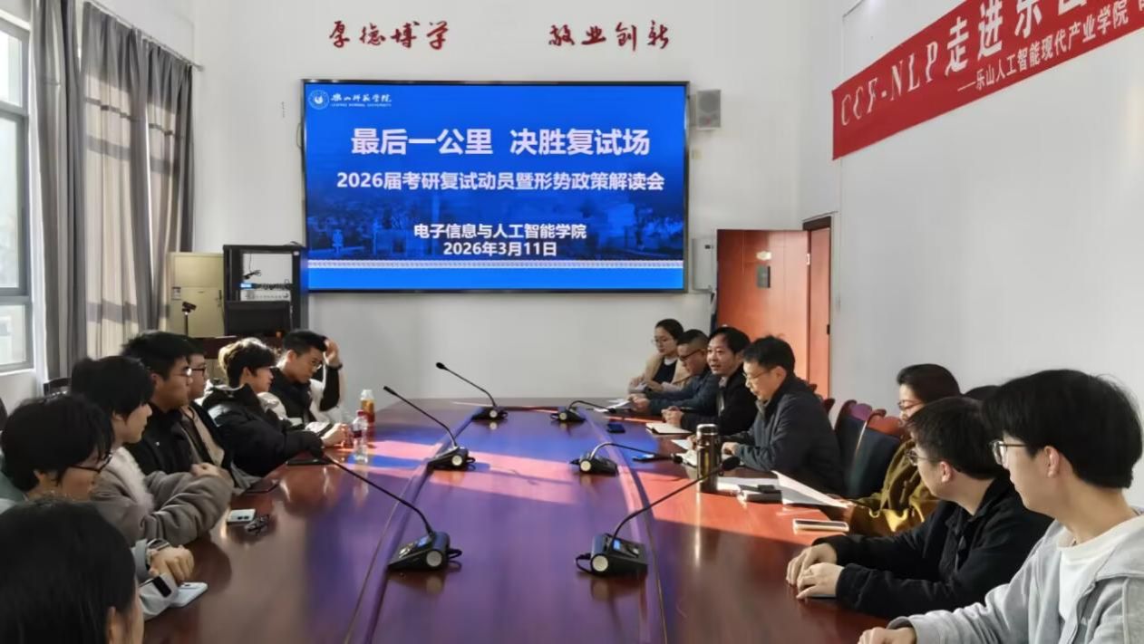 本网讯(文/陈锐熙 图/司强)为护航2026届考研学子冲刺复试,明晰备考方向、掌握应试技巧,3月11日上午,电子信息与人工智能学院在特教C501教室召开考研复试动员会。本次会议由AI引航辅导员工作室主办,学院党委副书记李骏主持,党委书记蒋强、副院长黄果、副院长李敏,辅导员肖苗及全体进入复试的学生参会。