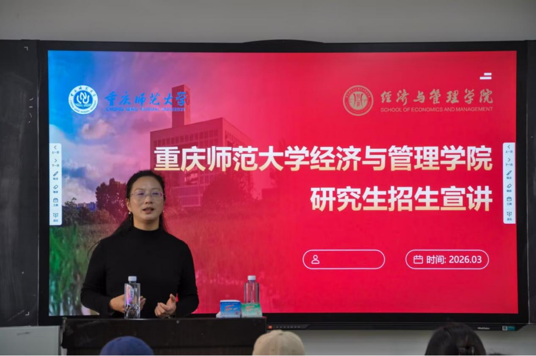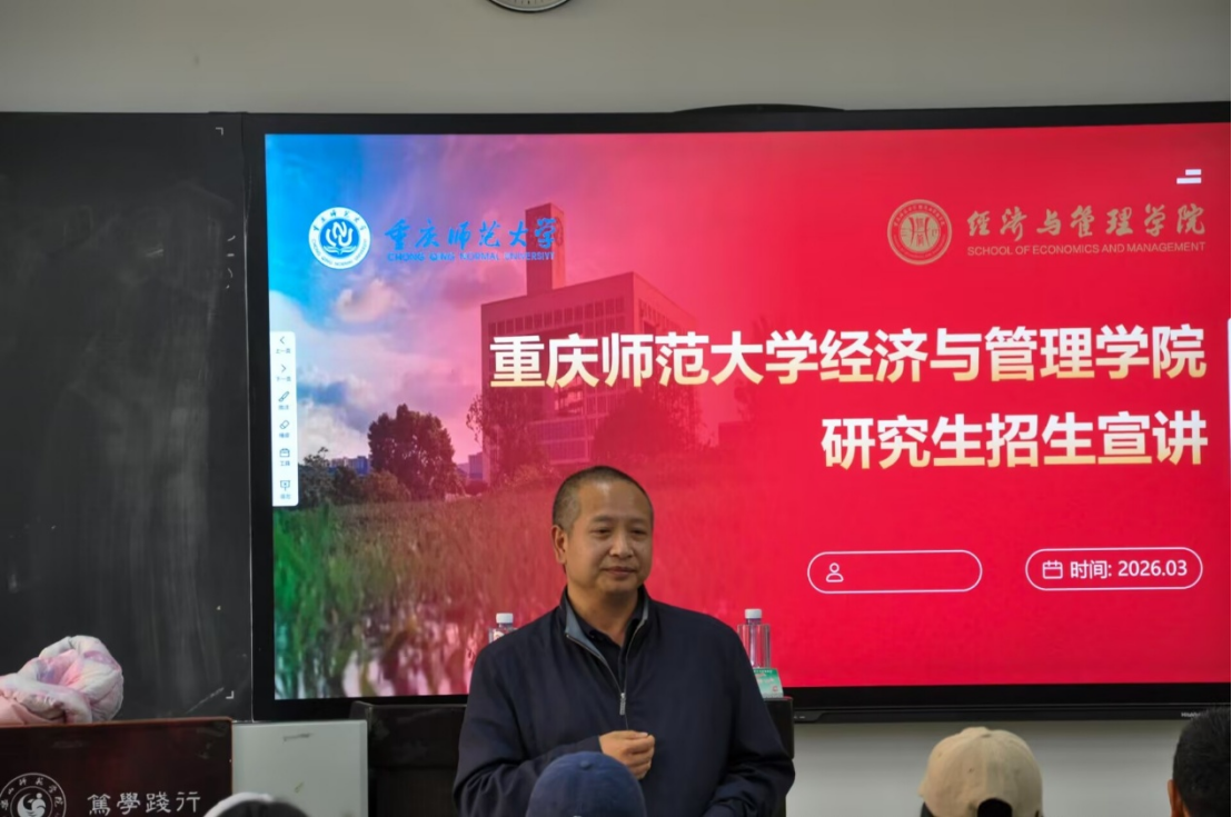 本网讯(文/李馨怡 图/孙宇鹏)3月26日下午,重庆师范大学来访我院,在行知楼210教室开展考研招生宣讲。重庆师范大学经济与管理学院教授杜家廷和院长助理苏莉,经济管理学院院长杨小川、副院长罗富民以及23级和24级有考研意愿的同学共同参与此次宣讲活动。