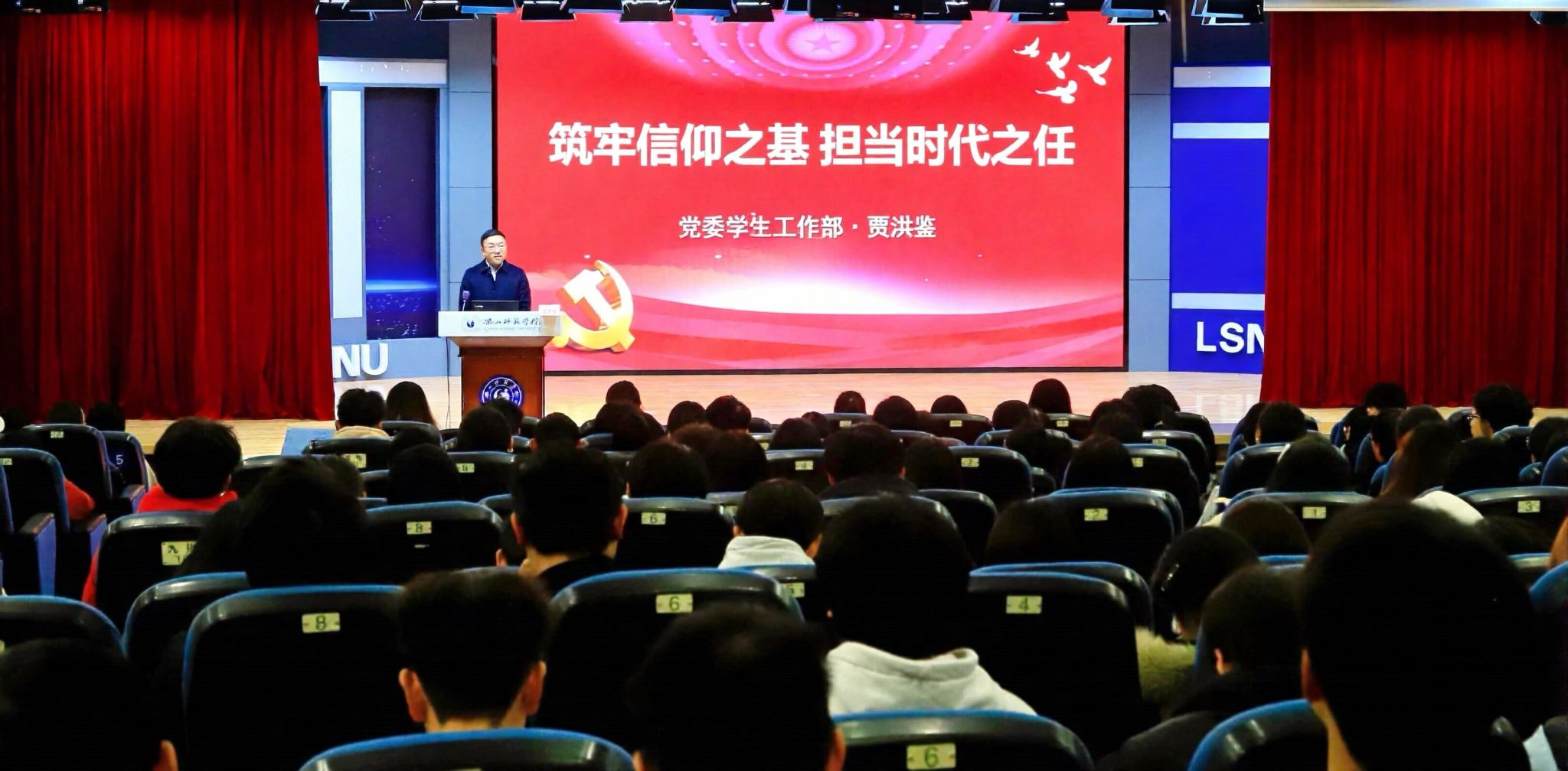 本网讯(文/明清清 图/谢汶廷)2025年11月27日晚7点,党委学生工作部部长贾洪鉴在旷怡楼一教八阶,为文学与历史文化学院、旅游与地理科学学院的学生骨干讲授专题党课,以“筑牢信仰之基担当时代之任”为主题,引导青年学子坚定理想信念,勇担时代使命。