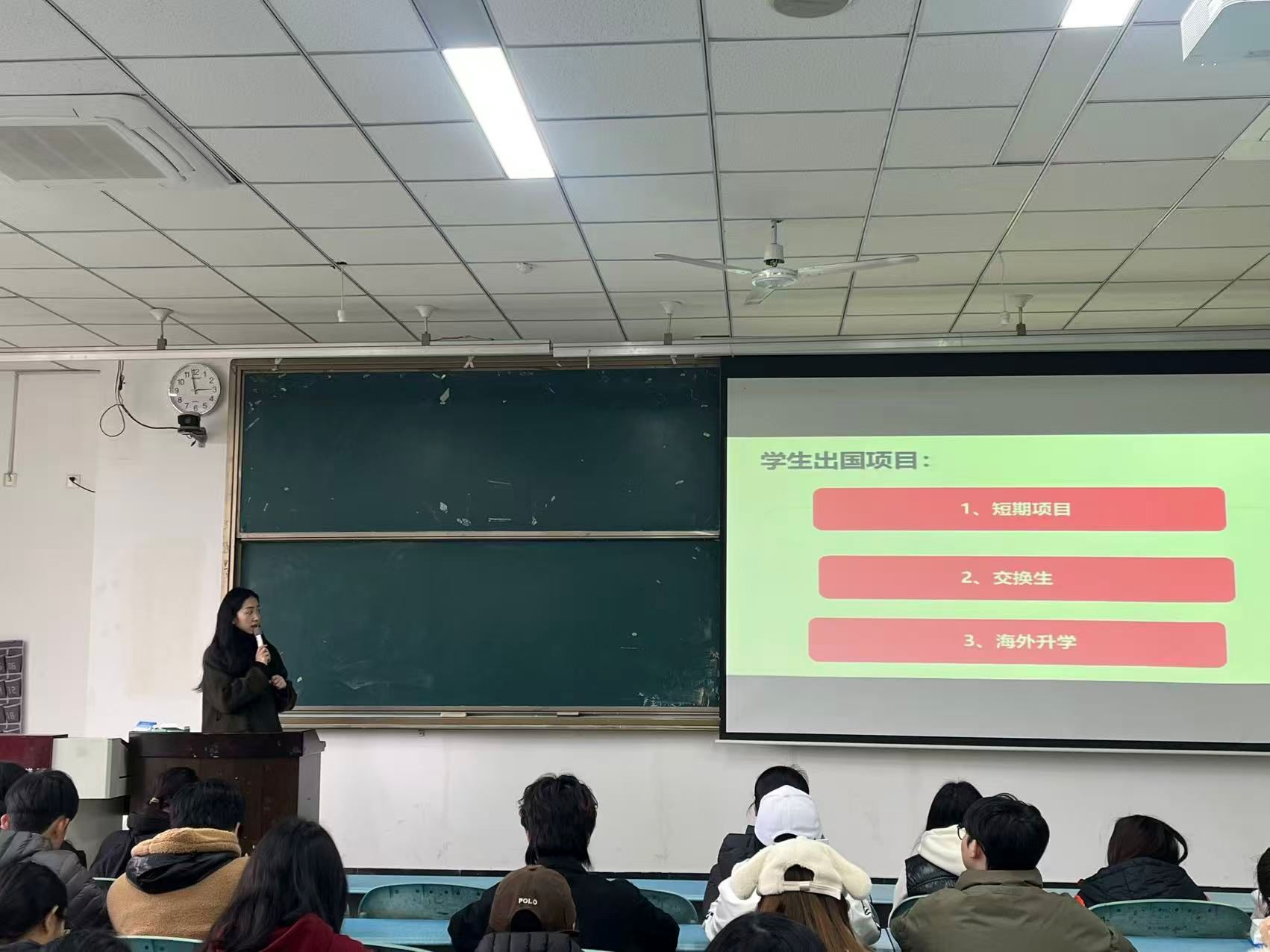 刘湘琳老师结合学校国际交流工作实际,围绕学子海外升学配套需求,详细介绍了我校各类国际交流项目,涵盖国际交换生项目、海外暑期及冬令营项目、国际中文教师志愿者派出项目等,全面展示了学校为学子搭建的多元化国际交流平台,鼓励同学们主动参与各类国际交流活动,拓宽国际视野、提升跨文化沟通能力,为海外升学和未来职业发展筑牢基础。此外,她还重点讲解了学校在学子海外升学过程中的各项帮扶举措,让学子们切实感受到学校的关怀与保障,增强了海外深造的底气。
