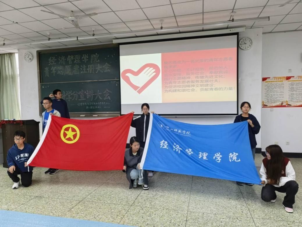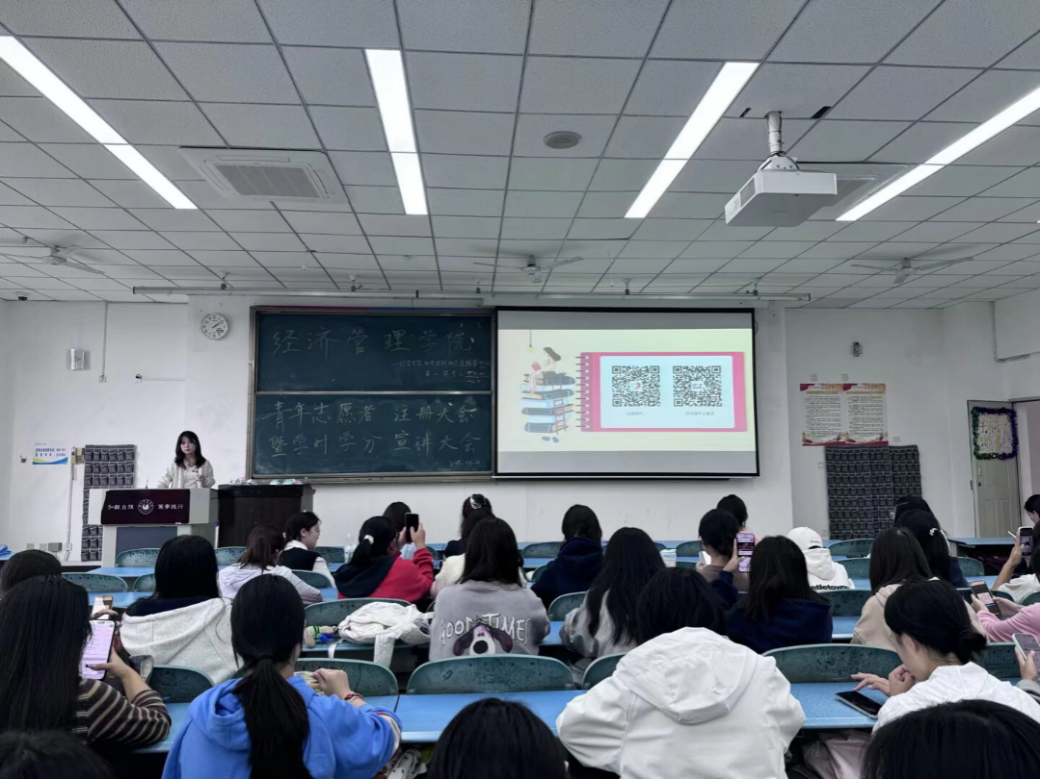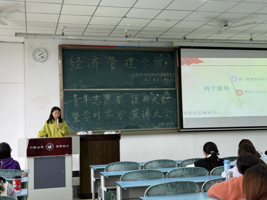 本网讯(图/余玥、胡馨元、邓永淼、鲜筱蝶 文/杨灿、赵梦袁、卢畅)玉露生寒,桂子飘香。为进一步壮大学院青年志愿者队伍,凝聚志愿服务力量,引导学生践行社会责任,10月20日下午,经济管理学院于行知楼教室召开青年志愿者注册大会暨学时学分宣讲大会。学院分团委学生干部、2025级新生及2023级专升本新生齐聚一堂,共同参与此次大会。