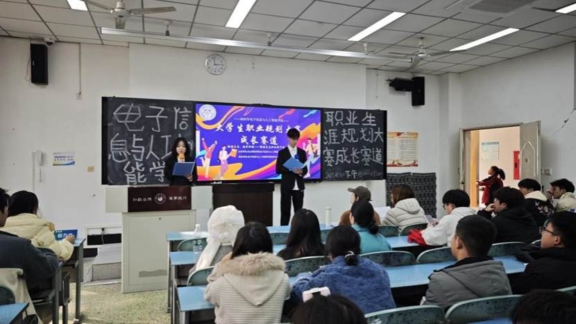 本网讯(文/陈娅、王浩然 图/王小艳、吕培涛)为引导学子明确职业方向,锤炼就业核心竞争力,以赛促学搭建职业发展交流平台,11月30日,电子信息与人工智能学院在行知楼111和112组织开展第三届职业生涯规划大赛。本次活动由AI引航辅导员工作室和学院易班分站共同主办,设成长赛道与就业赛道,覆盖全院各年级学生,辅导员王杰、徐星悦、主席团成员和学院部分同学共同参与。