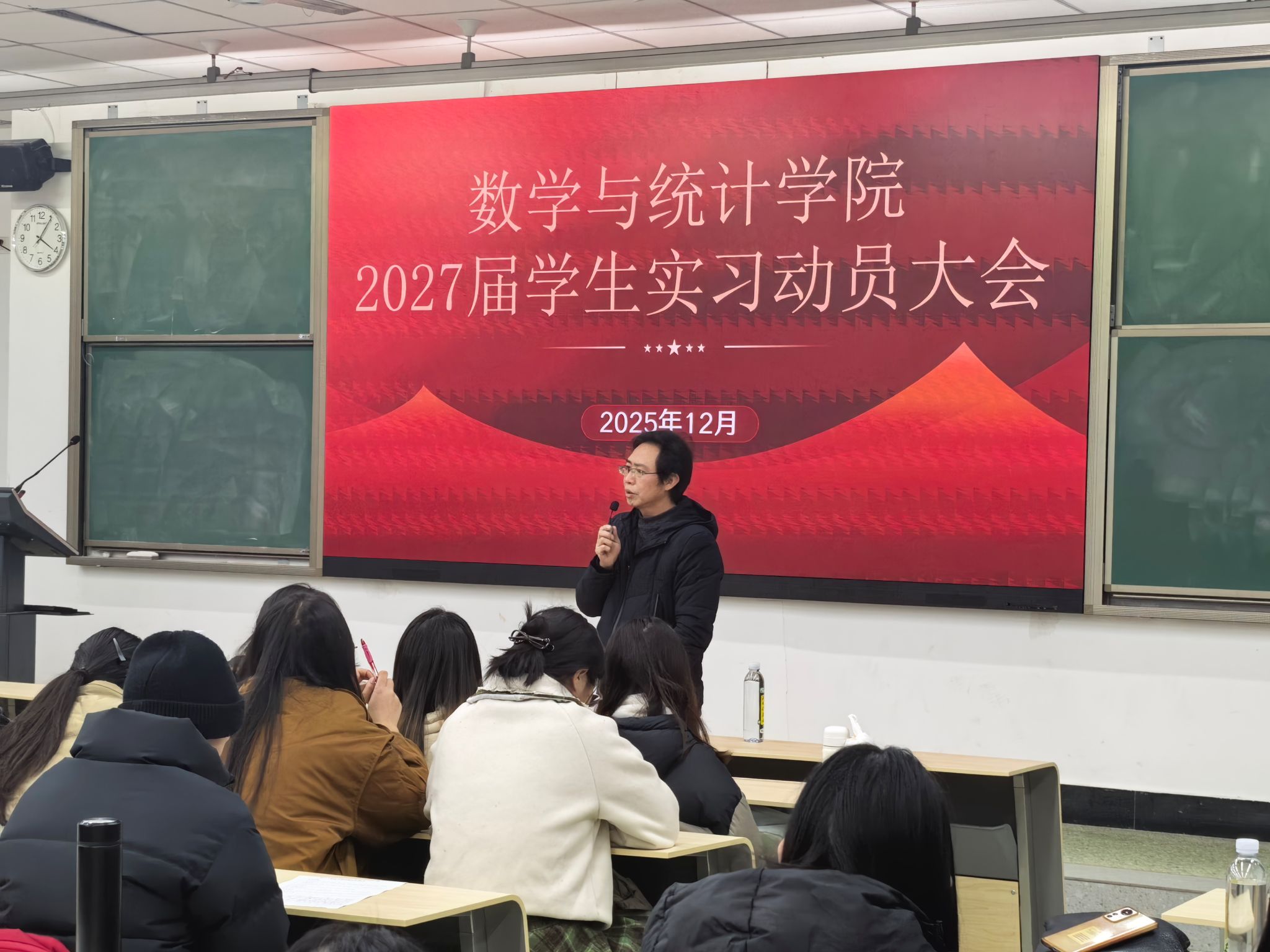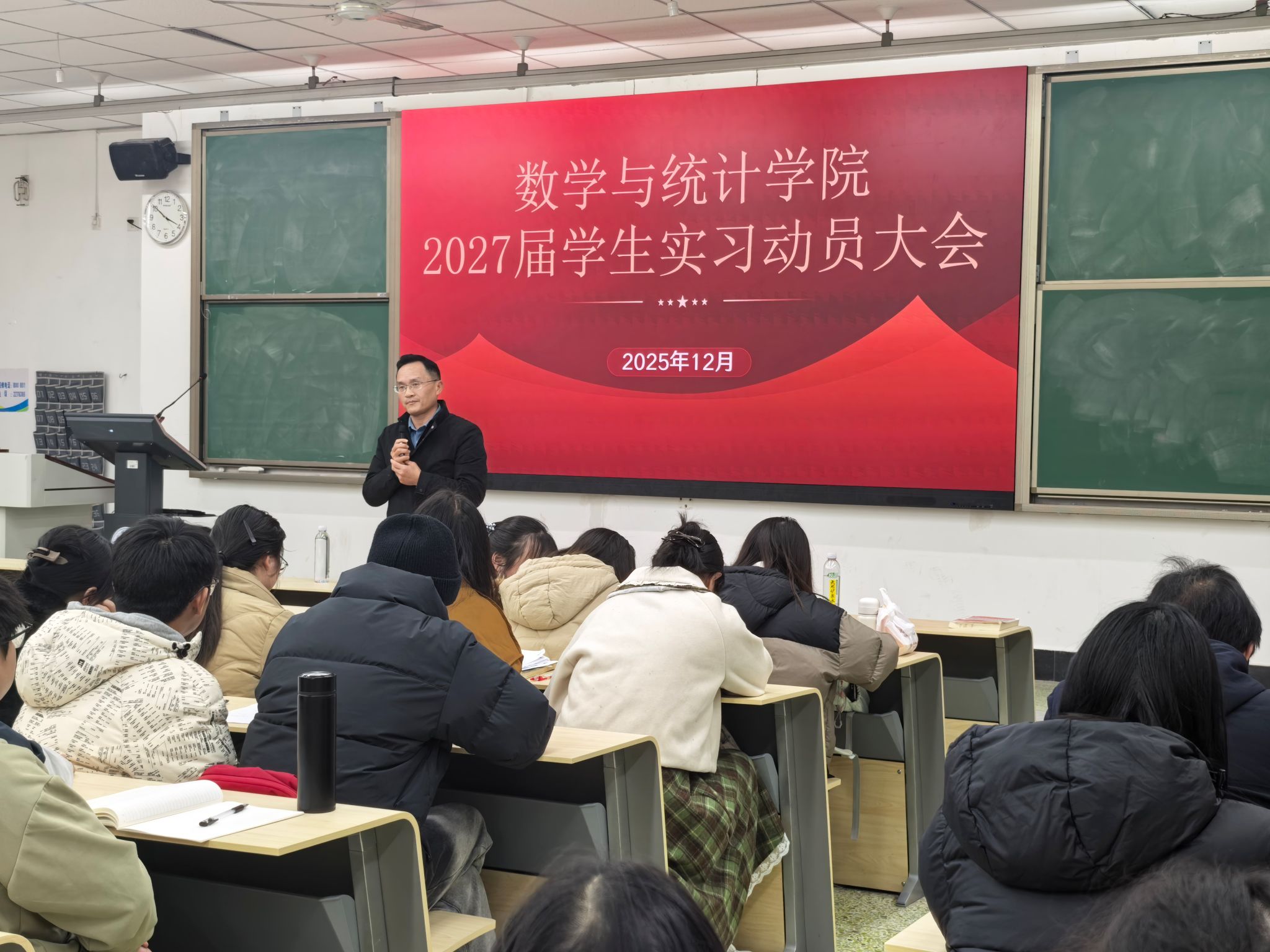 本网讯(文/胡云娇 图/黄彩城)为扎实推进实践教学高质量开展,引导学生明晰职业发展路径,夯实就业竞争力基础,12月31日,数学与统计学院于行知楼125教室召开2027届师范生实习动员大会。学院党委书记马力强、院长屈小兵、党委副书记夏红、副院长孙海、实习负责人杨建辉老师,各年级辅导员及全体大三学生齐聚一堂,共商实习规划,共话成长蓝图。
