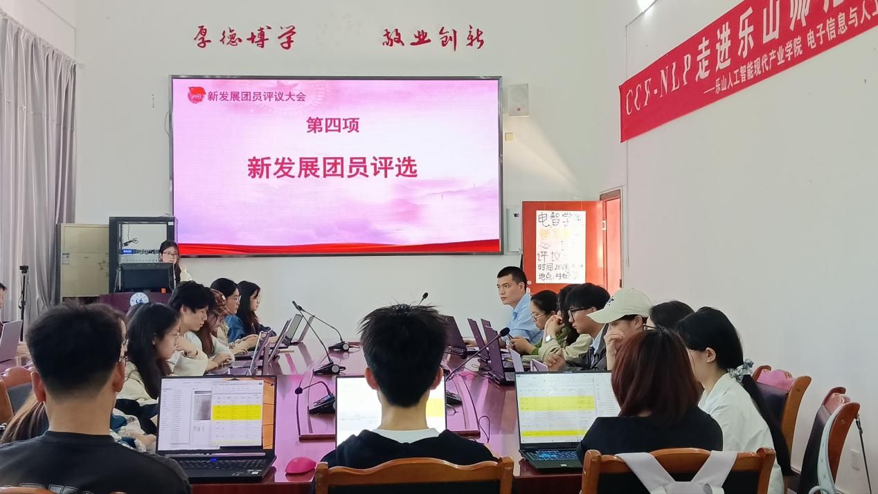 会议在迎团旗、唱团歌仪式中开始,全体高唱《光荣啊,中国共青团》。狄红霞宣读评议纪律与细则,强光平解读《电子信息与人工智能学院团员发展工作实施办法(试行)》,强调坚持“公平、公正、公开”原则,要求评议成员严谨履职。评议环节,与会人员围绕候选人的思想觉悟、学业成绩、志愿服务、社会实践及对团组织的认识等方面展开全面评议,客观评估其综合素质。经充分讨论,全体评议成员进行民主投票,最终形成新发展团员名单。